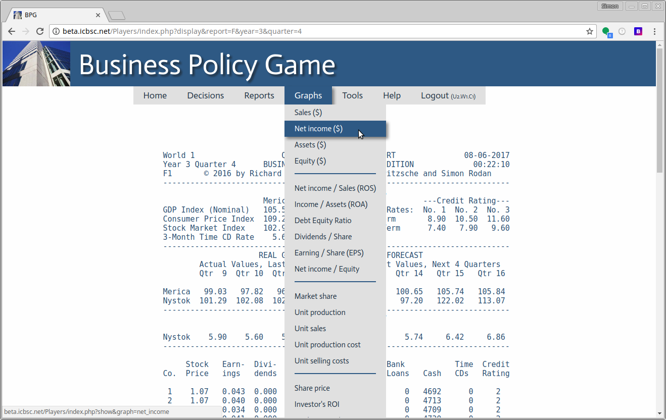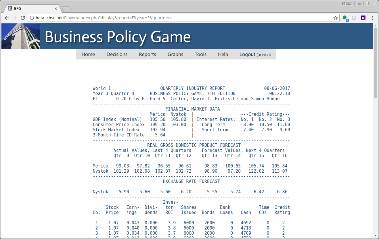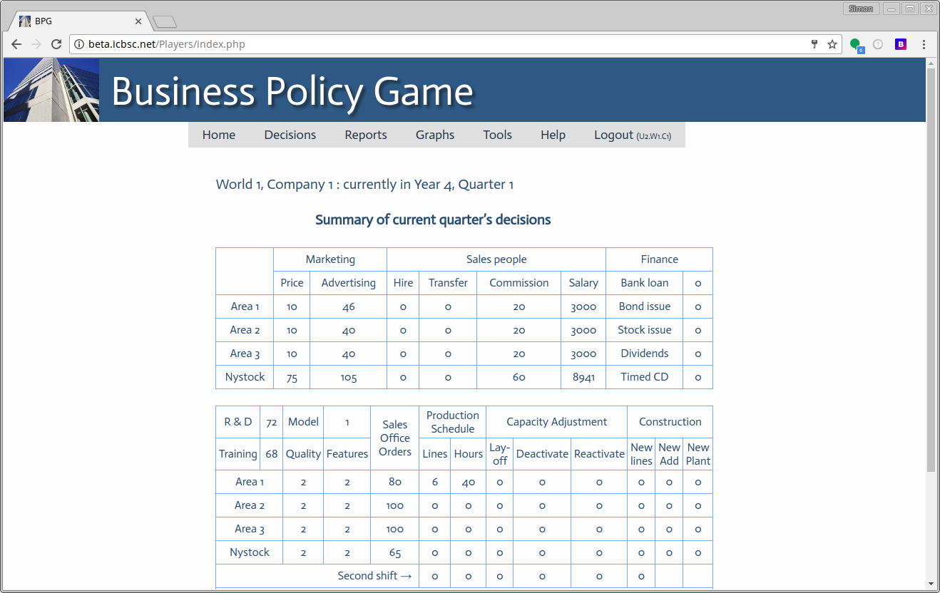 This is the simulation home page. It shows a summary of the last set of operating decisions.