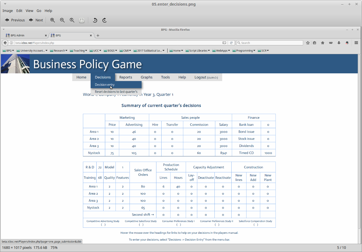 To enter your decisions for the current quarter, use the menu bar and navigate to "Decision entry" as shown below.