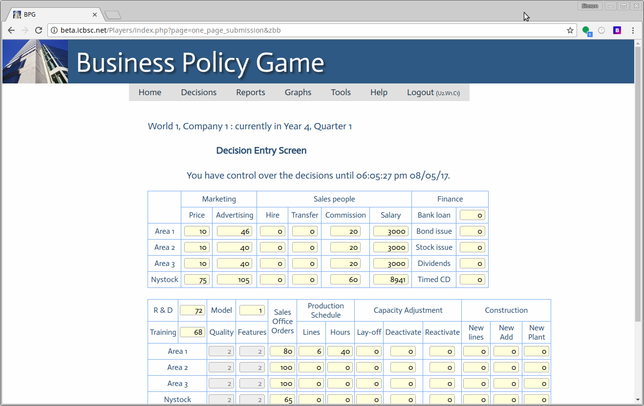 The decision entry screen looks like the home page summary except the fields are open for you to enter your decisions.